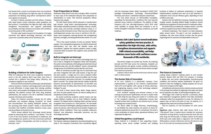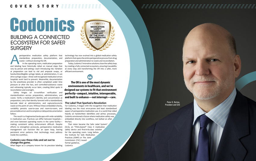 As Peter O. Botten, president and CEO reflects, “Codonics Safe Label System turned medication safety guidelines into best practice. It standardizes the high-risk steps, adds safety, strengthens documentation and supports 340B-related accountability, and helps clinicians move faster with confidence across thousands of ORs worldwide.”